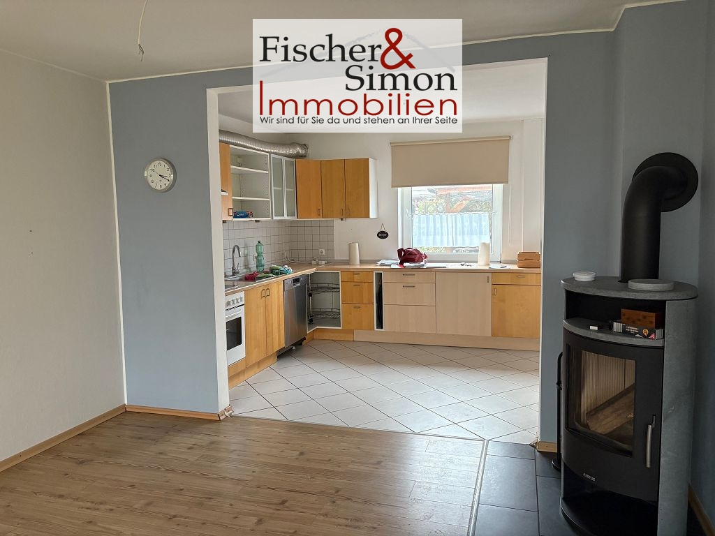 EG: Windfang, G-WC, Flur, offene Küche, großes Wohnzimmer/ Esszimmer mit Kamin und Zugang zum überdachten Freisitz